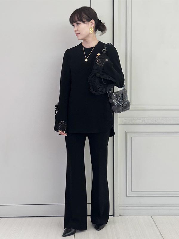小物はマメクロゴウチのバッグとパンプスをあわせて、王道で綺麗めなコーディネイトながらセンスが光る着こなしに。