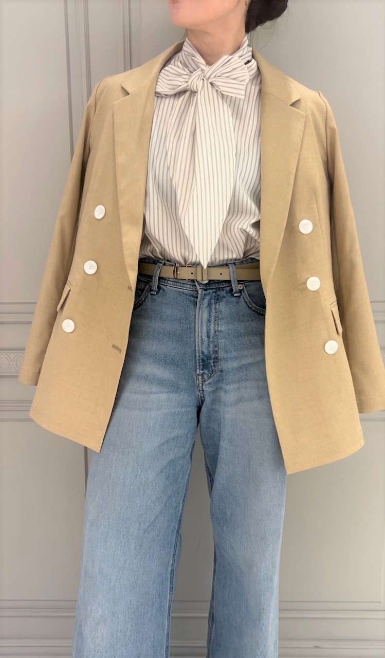 同じボウタイブラウスも、デニム合わせで週末のお出かけにも。