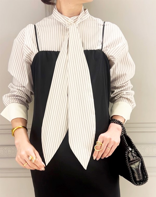 このスタイリングで旅行やお出かけから、ちょっとしたセレモニーシーンにもぴったりです。ジャケット合わせをすれば、更にかしこまったシーンでも着用可能○