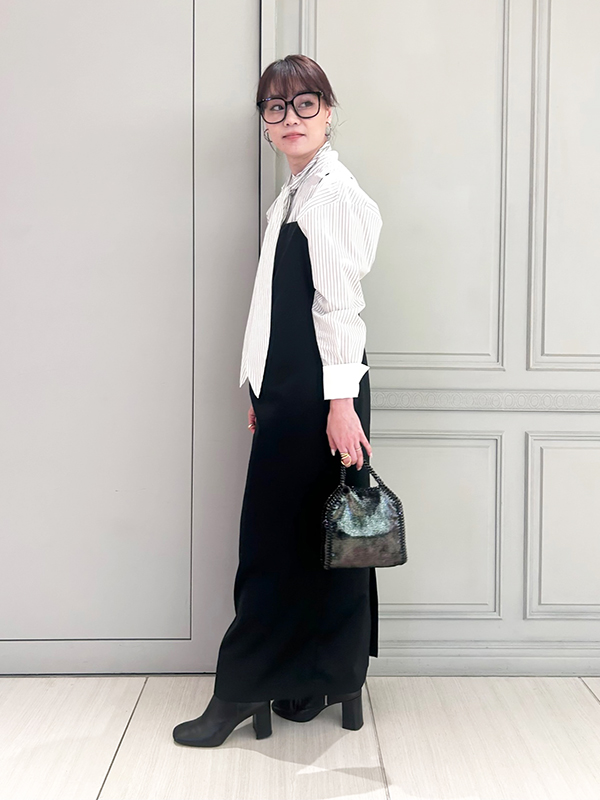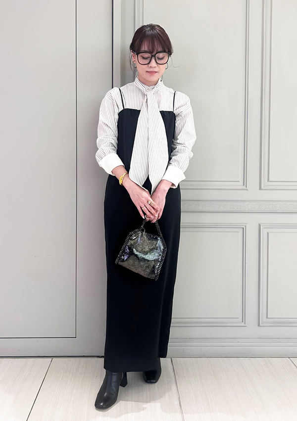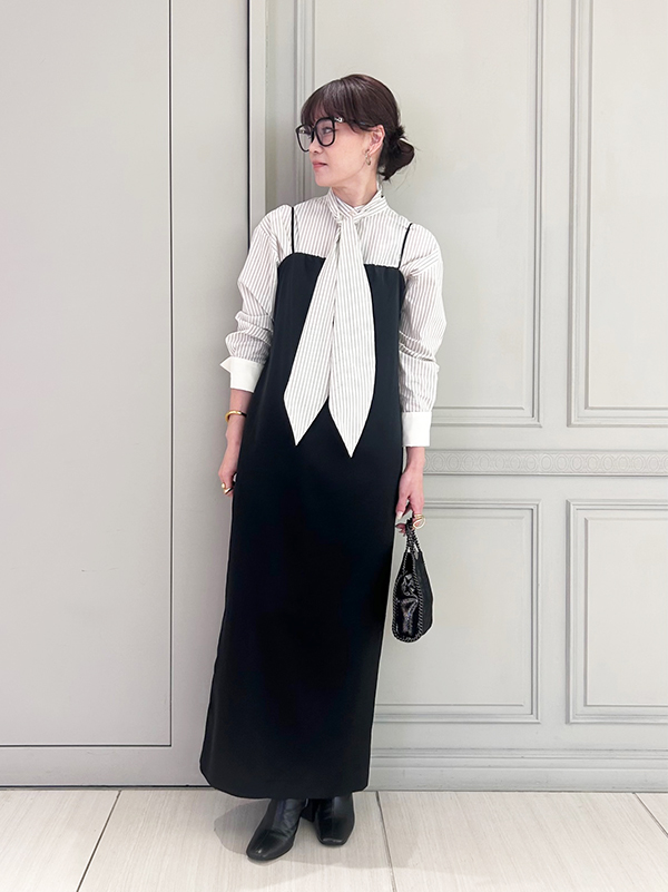 会食のシーンでは、艶感のあるワンピース合わせもオススメです。