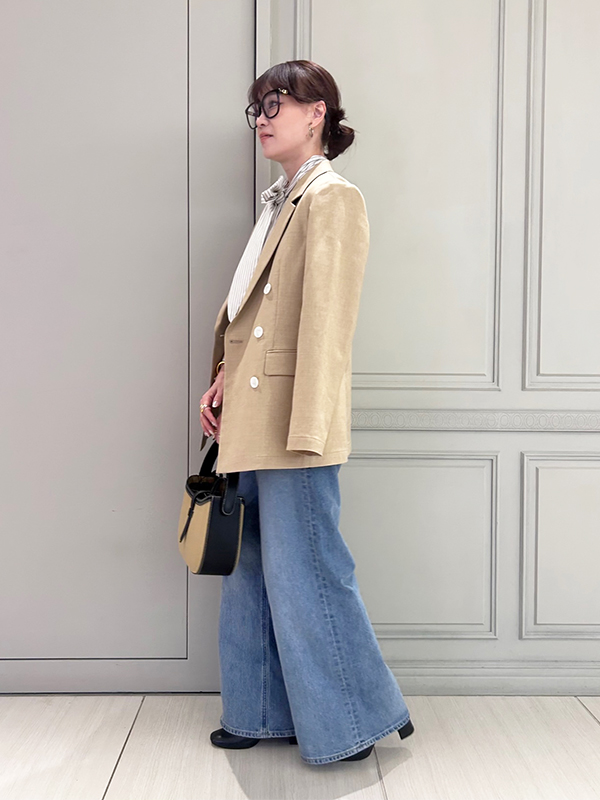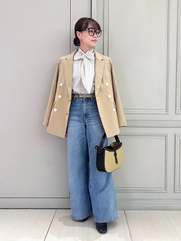 ワイドパンツ合わせで、リラックス感のあるデニムスタイリングの中にもボウタイや女性らしいアイテム合わせでカジュアル過ぎず大人のカジュアルコーディネートの完成です!