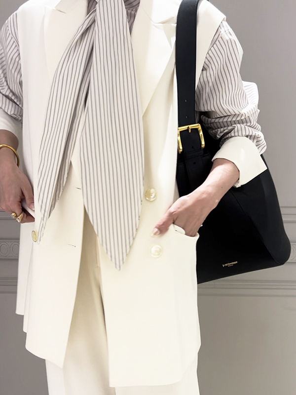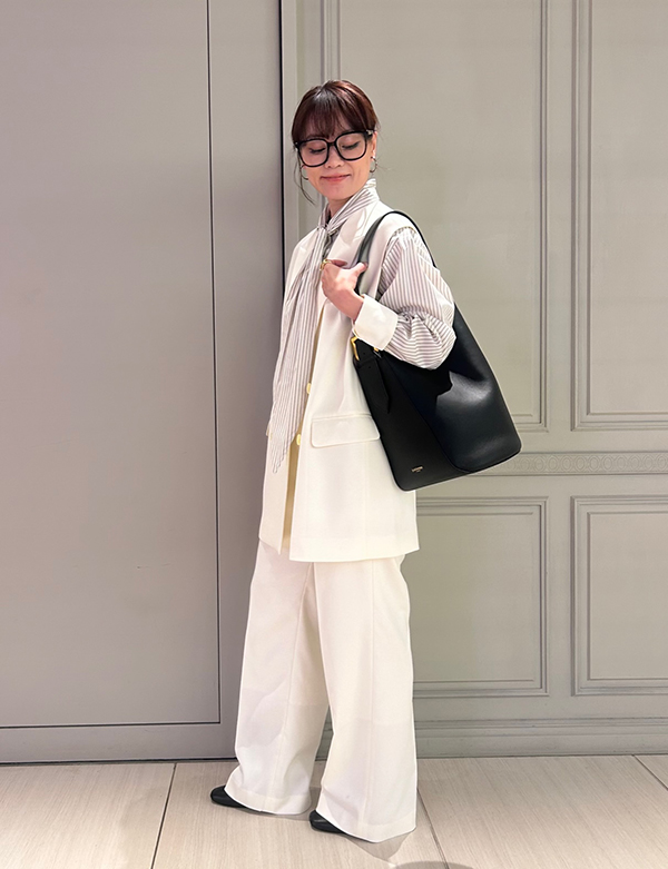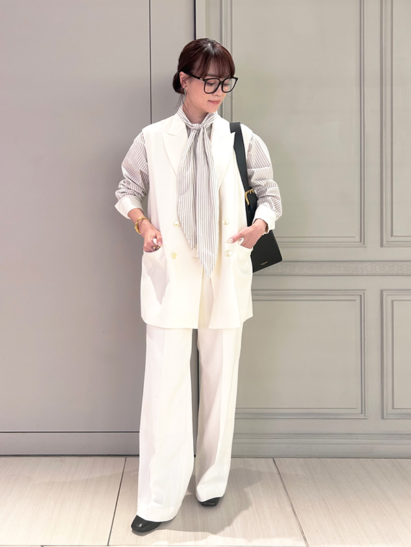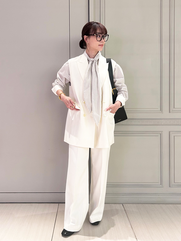 合わせたのはPARIGOT PRESTIGEのデザイナーズスーツを手掛ける工場で仕立てた美しいシルエットセットアップ。纏うだけで華やぐラグジュアリーな「ホワイト」の魅力ですよね。
