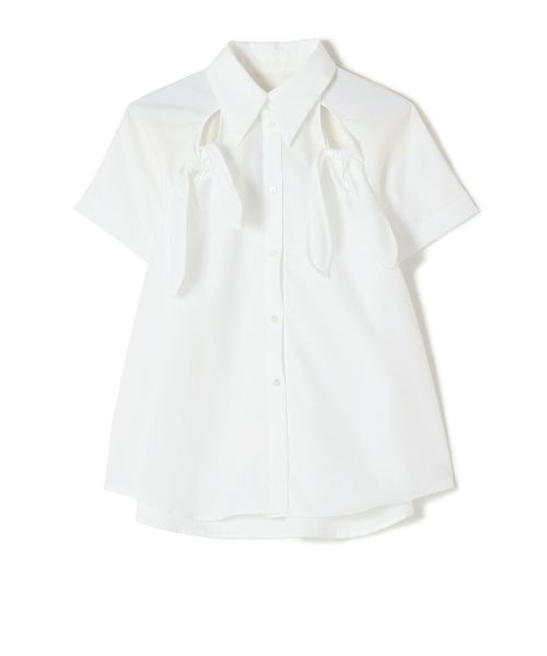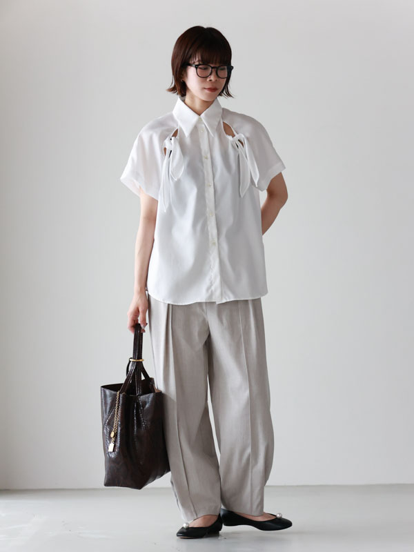 グレーはキレイ目に女性らしく着たい!ということでフロントのデザインが特徴的なIHNN(イン)の白ブラウスを合わせて、夏にぴったりな爽やかなスタイリングにしてみました。