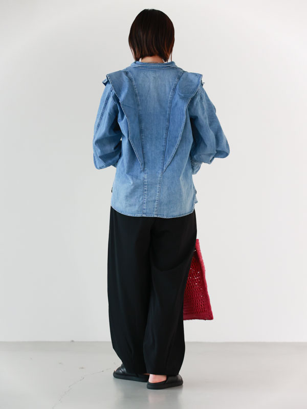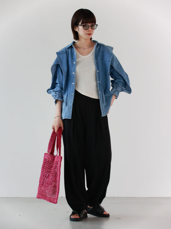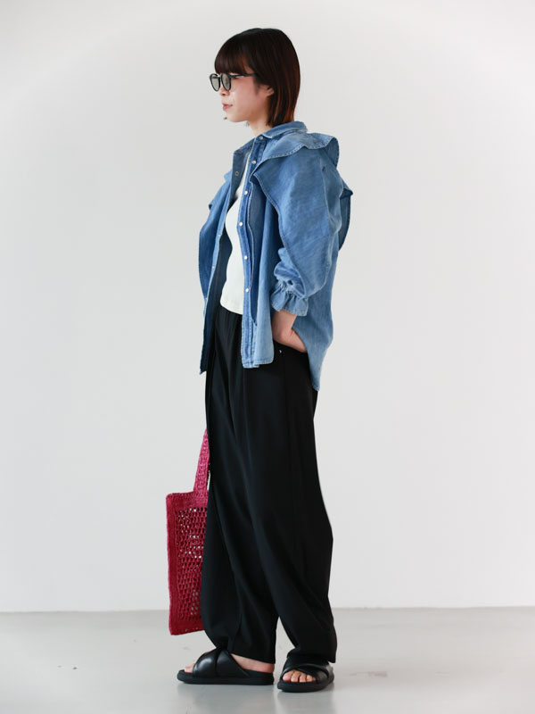カーブパンツが絶妙なラフさをプラスしてくれるので、デニムシャツなどのカジュアル素材とも相性良く着用いただけます!