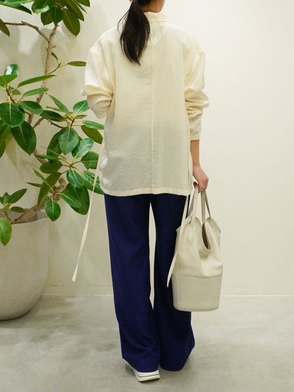 リネン混の涼しげな素材が蒸し暑くなるこれからの季節にぴったりです。バイオ加工で綿麻の毛羽を落とすことで、麻のさらりとした素材感は残しつつ、すっきりとキレイ目に仕上がっております。生地の79%がポリエステルなのでシワになりにくく、お洗濯も可能なのでヘビロテ間違いなしです!