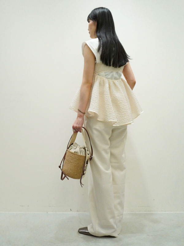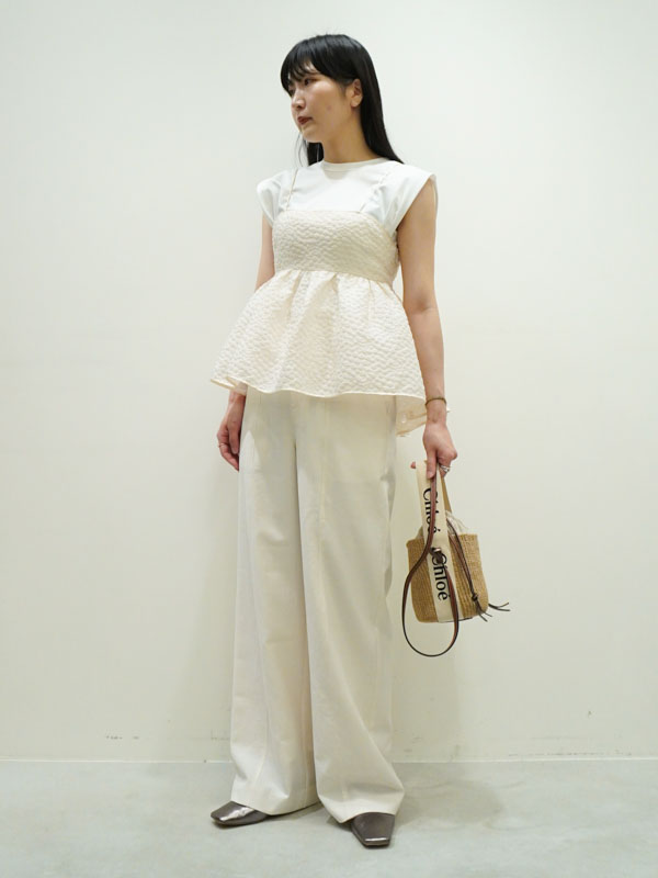 オールホワイトでまとめた軽やか夏スタイリング。同系色でも素材感の異なるアイテム同士なら表情が出て、白でもぼやけにくいのでおすすめです!