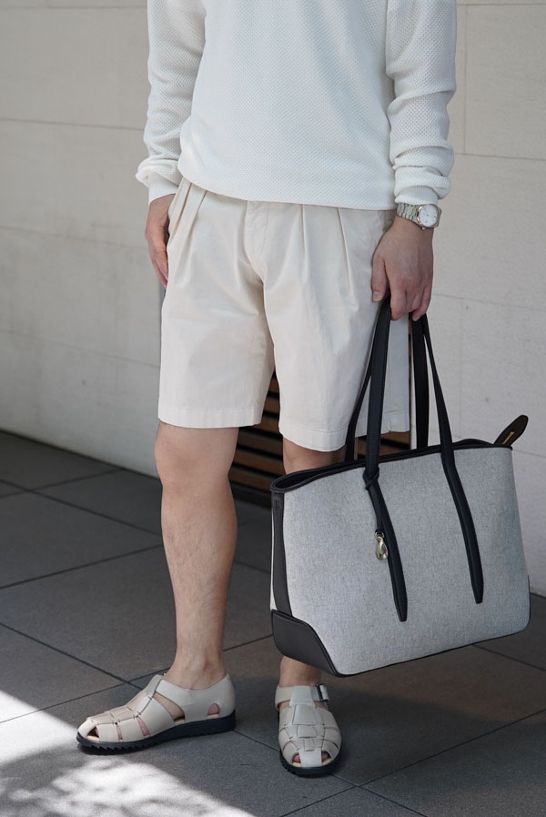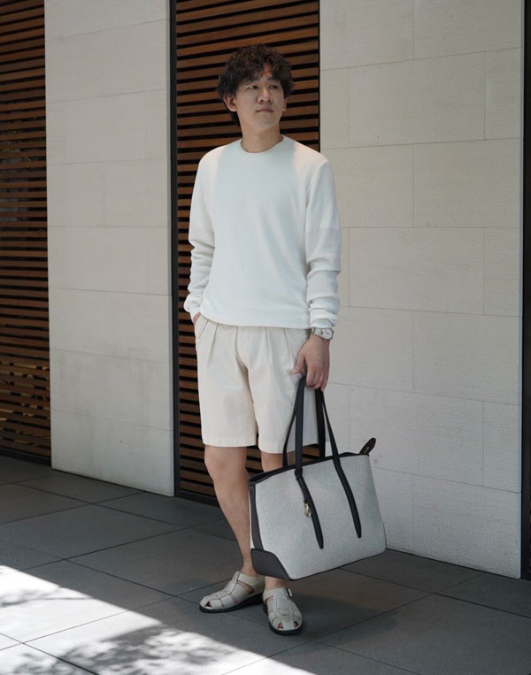 今回着用したニットは編地がメッシュのようになっており、着ていて全く暑さを感じさせません。そして、ショートパンツは2タック入ったものをチョイス。こなれた雰囲気と長袖ニットの適度な余裕感、手に持ったトートバッグまで色味を白系で統一することによりリゾートスタイルをより加速させております。