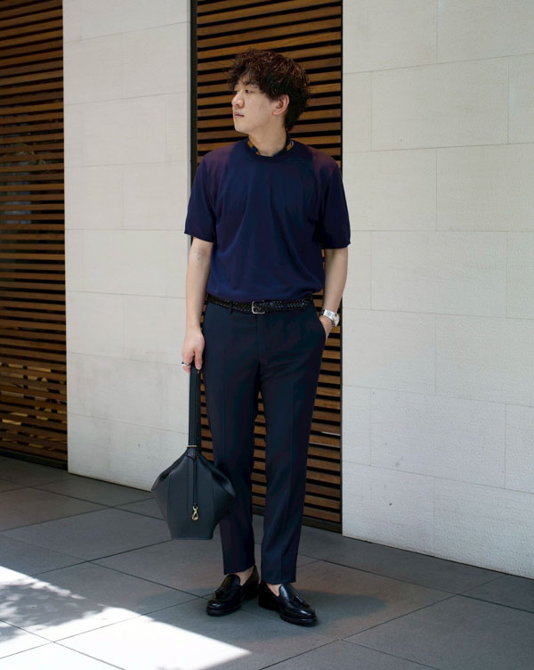 シルクを100%使用した素材でしたので、その質感を活かしネイビーのグラデーションになるようパンツもネイビーに。小物の色をブラックで統一しやや高級感のあるスタイリングに仕上げました。