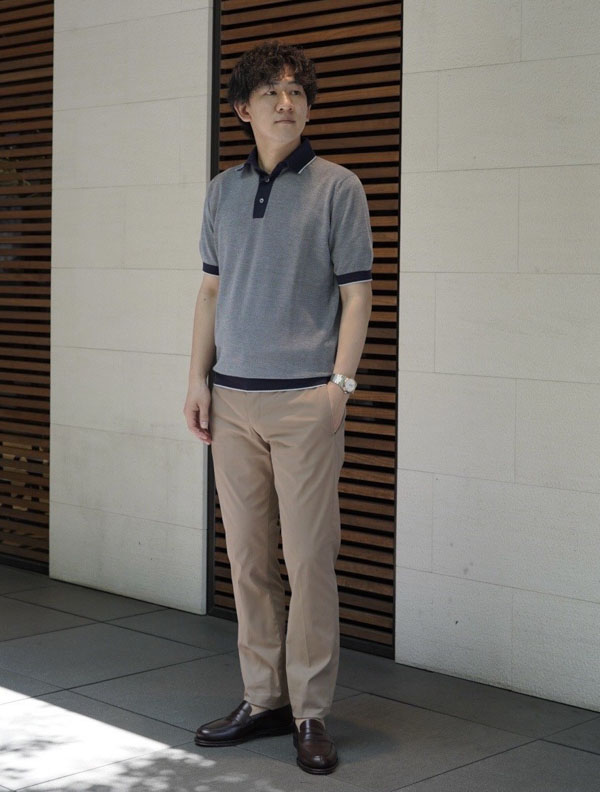 ネイビーの色味を使ったニットポロでしたのでパンツはベージュ、靴はブラウンで合わせてオフィスカジュアルでも着ていただけるようコーディネートいたしました。