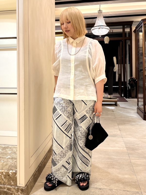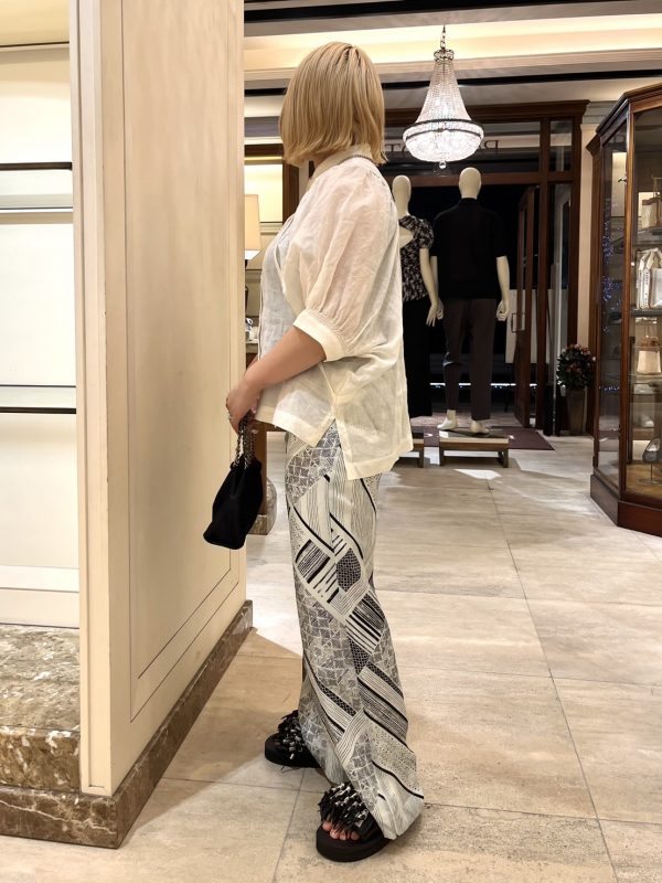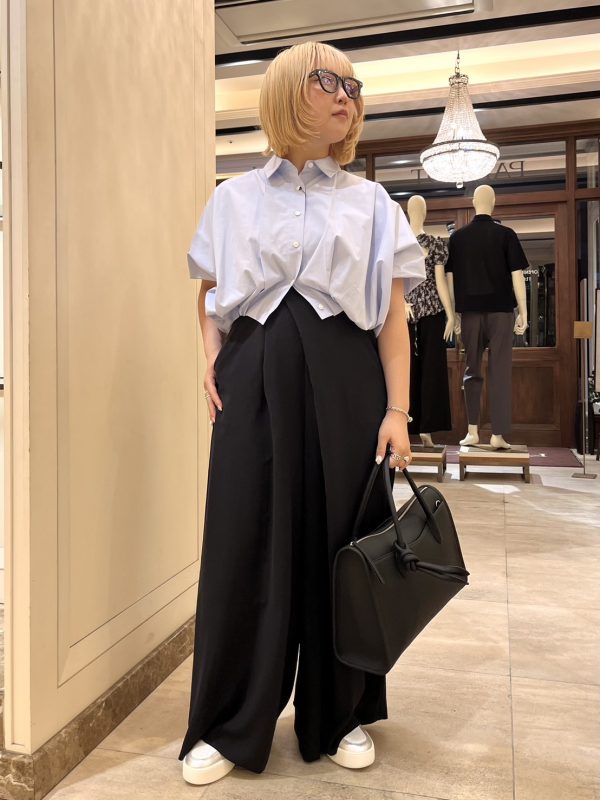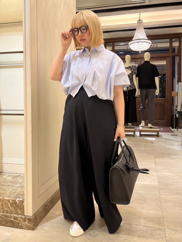 ショート丈ブラウスは着用すると上重心になるので、ワイド系のパンツやボリュームスカートと合わせて下にも重心を出してあげると、バランスの取れた綺麗スタイリングとなります✨