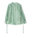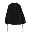 透け感のあるオーガンジー素材が涼やかな印象のシアーブラウス。バンドカラーとボリュームスリーブで女性らしく、ドロスト仕様でシルエットのアレンジも自在な一着です。