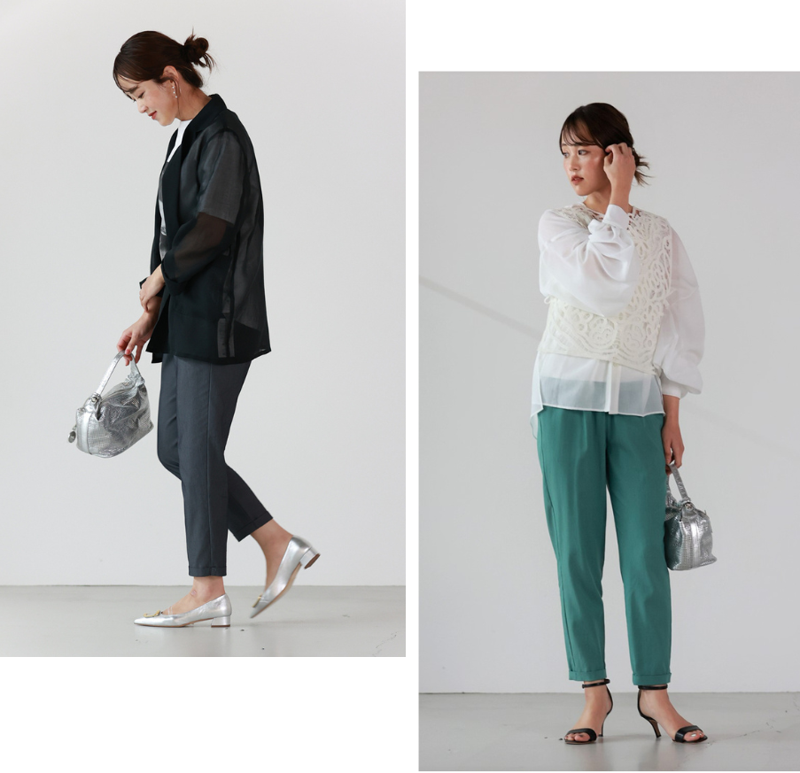 美シルエットと快適さを両立したテーパードパンツ。上品な艶感のある伸縮素材で、オンオフ問わず活躍。シワになりにくく、お手入れも簡単です。