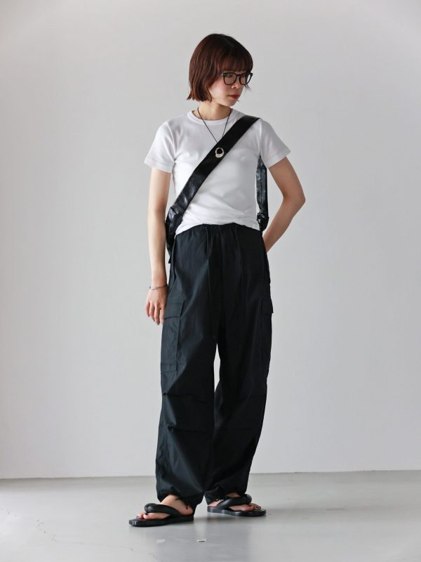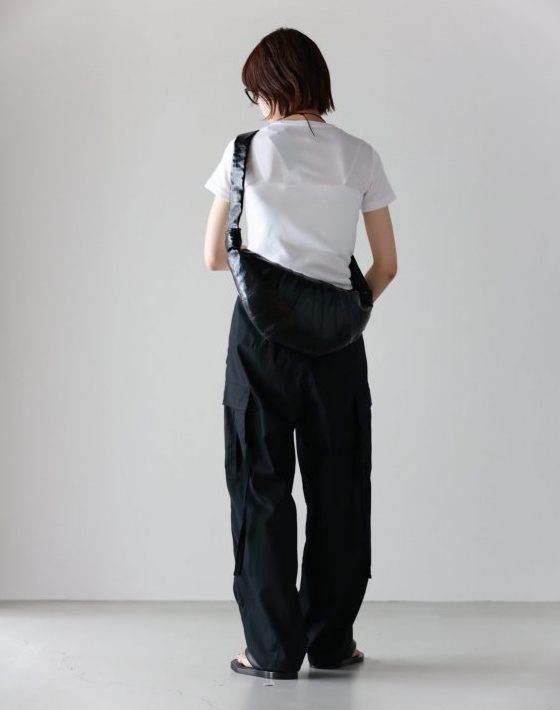 「街に溶け込む光沢感。クロワッサンバッグでつくるラフスタイル」