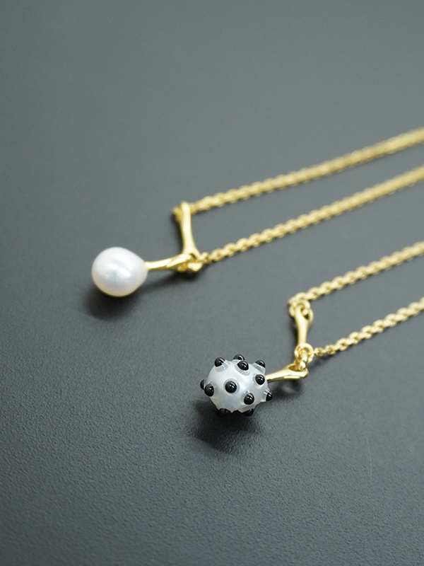 「Sagene necklace」はアシンメトリーのパーツが特徴的なネックレス。シンプルながらもさりげないアート性にマリアブラックらしさを感じます。