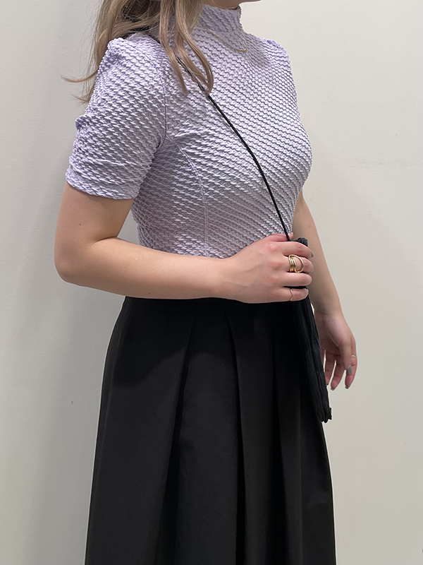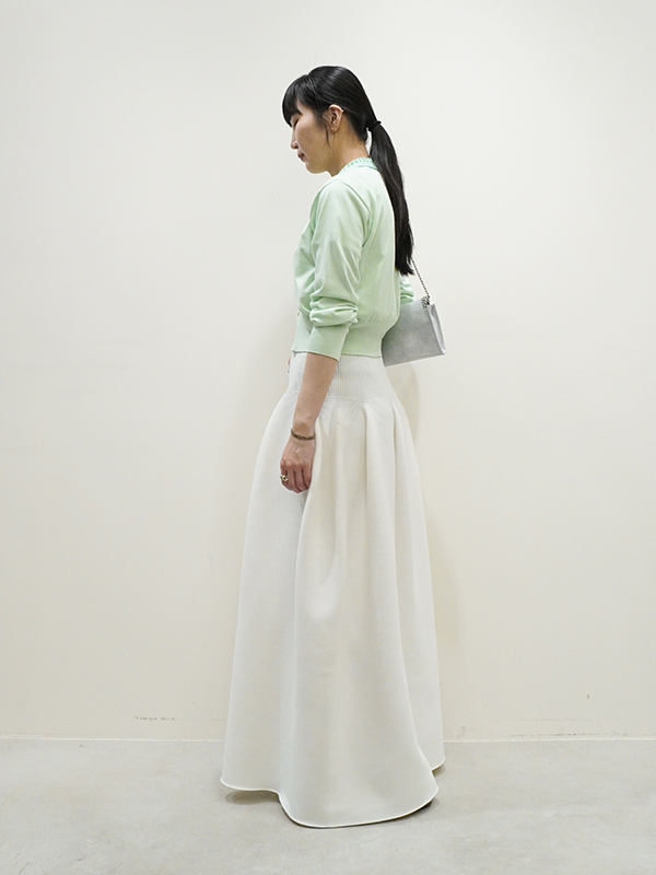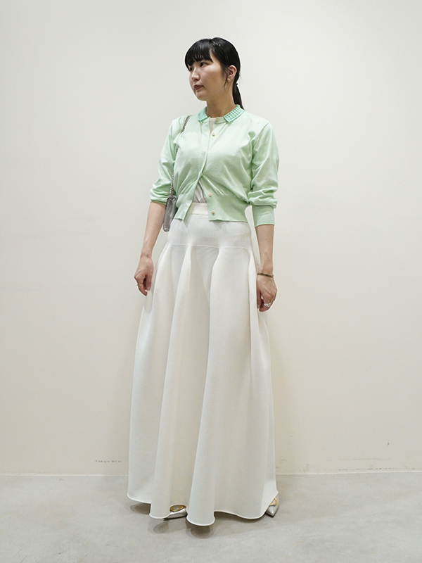 年中ブラックを愛用している私ですが、きれい色は淡めのカラーでまとめるのが気分です。ボリューミーなスカートを合わせることでトップスの華奢さが引き立ちます。