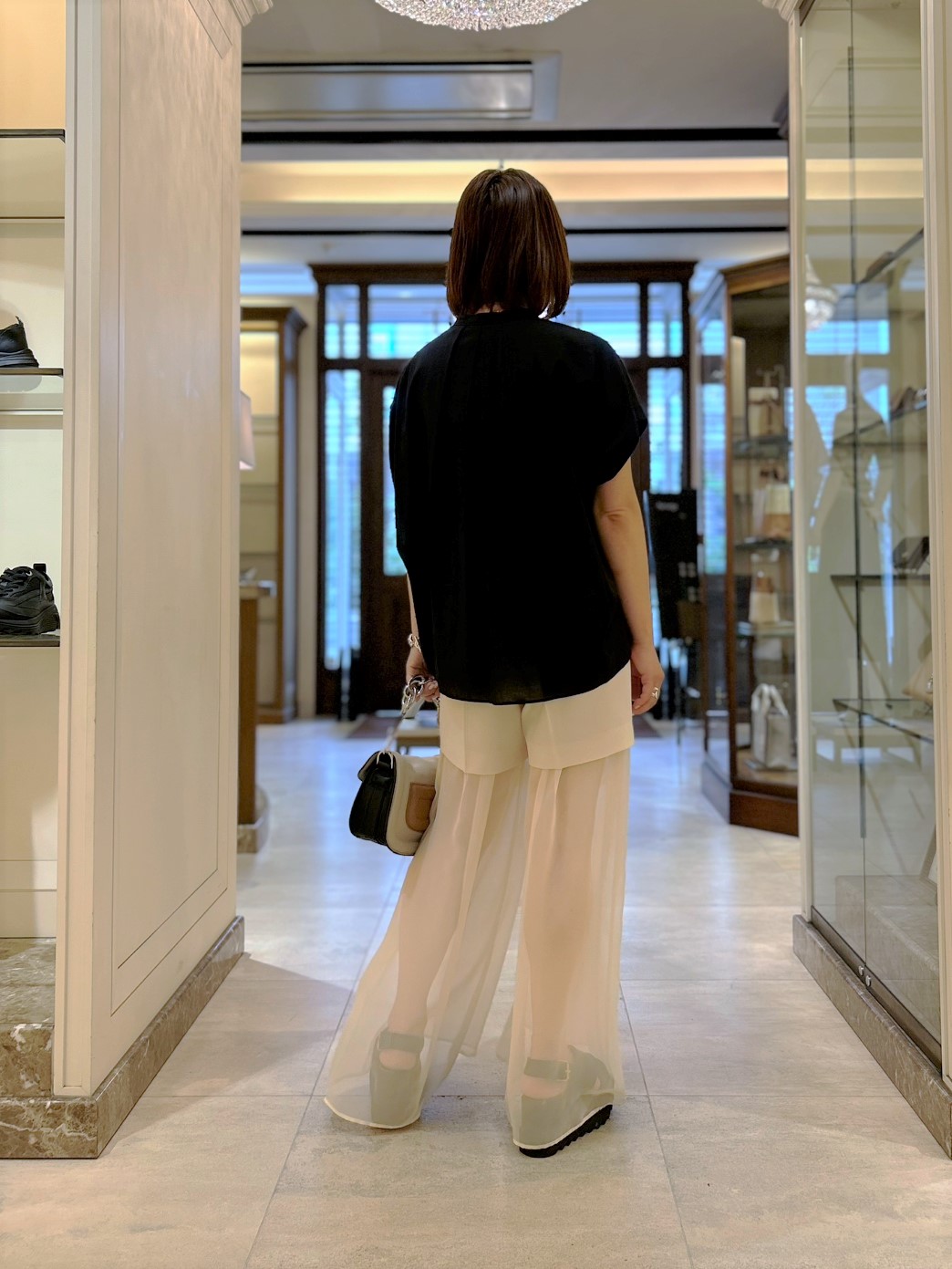 フラットサンダルでラフなリゾートスタイルで合わせてみました。秋口にはインナーにシアートップスを合わせてシーズンレスに着こなせるのも魅力です。