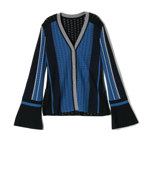 日本建築の格子からインスピレーションを受けたブルー×ブラックのストライプ柄が、立体的な編み地を引き立てた、印象的なジオメトリックニットカーディガン。