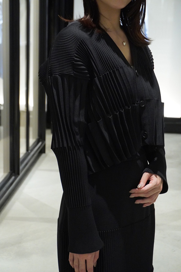 ブランドを象徴する3Dニットの技術を活かした、アコーディオンカーディガンとスカート。