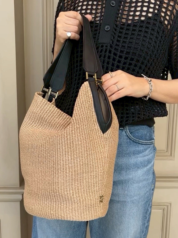 上品な風合いが魅力のラフィア調シートを使用したかごバッグです。2本のハンドルがポイントになったデザインです。長財布やペットボトルなどが入る収納力が備えられているので、幅広いシーンでお使いいただけます。