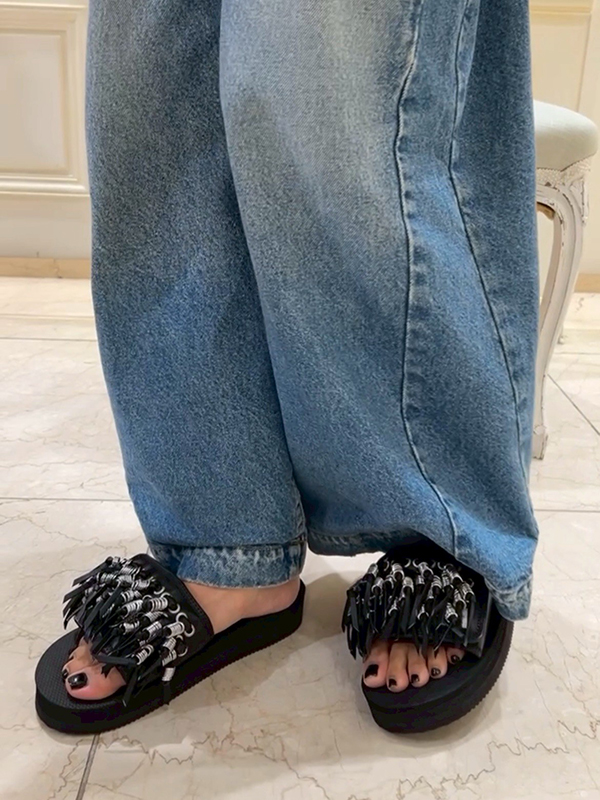 アッパーには、TOGAのアイコンともいえるメタルリングとフリンジが大胆に施され、足元にモードさをプラスし、洗練されたムードを演出します。
