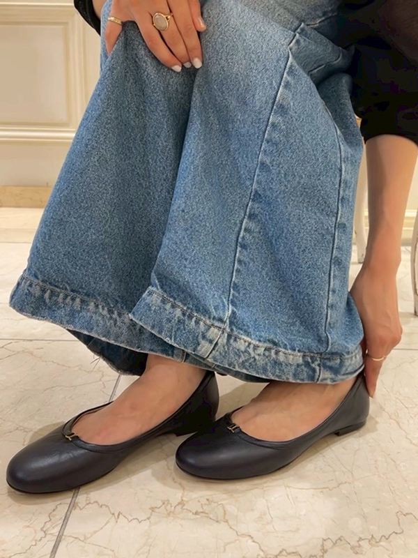 しなやかなパンチング加工のカーフスキンを使用したバレエパンプス。アイコニックなゴールドの金具がさりげなくあしらわれています。