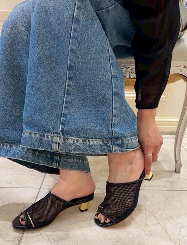 メッシュ素材にメタルがアクセントとなるデザイン。足もとのジュエリーのように、ゴールドのパーツが目を惹くサンダルです。