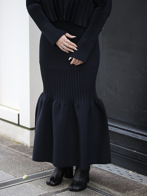 「ニット」ときくと、カジュアルでほっこりしたイメージがありシーンにそぐわないと思われるかもしれませんが、CFCLのニットはハイゲージで滑らかな質感や構築的なデザインのため、オケージョンシーンにも着用できます。