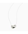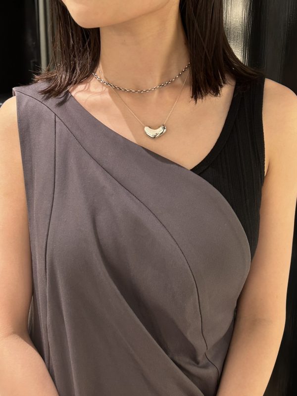 厚みのあるハート型トップが印象的なネックレスに、ハードな細チェーンを重ねたスタイル。