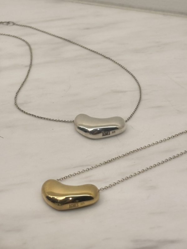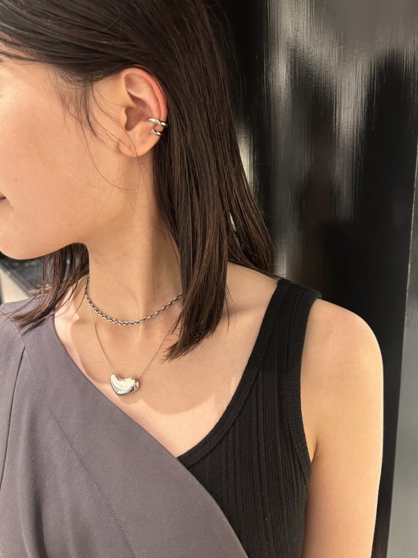立体感のある丸みと、シャープなチェーンのバランスが絶妙で、シンプルなトップスにもアクセントをプラスしてくれます。