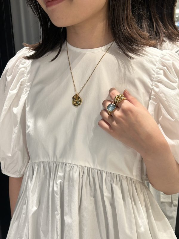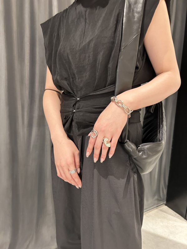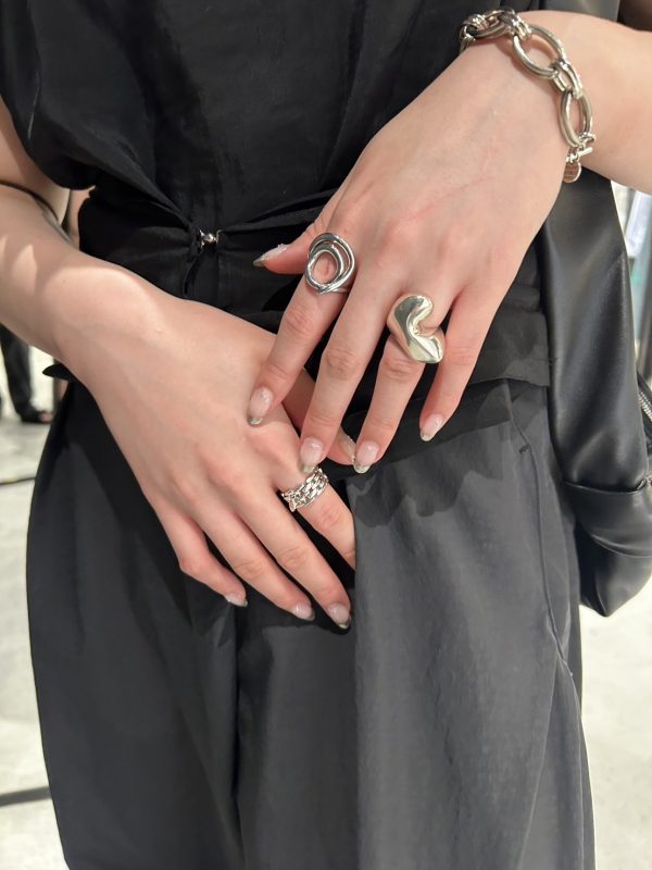 ボリュームのあるリングやバングルは、曲線的なフォルムが女性らしさも感じさせ、ハードになりすぎない絶妙なバランスに。