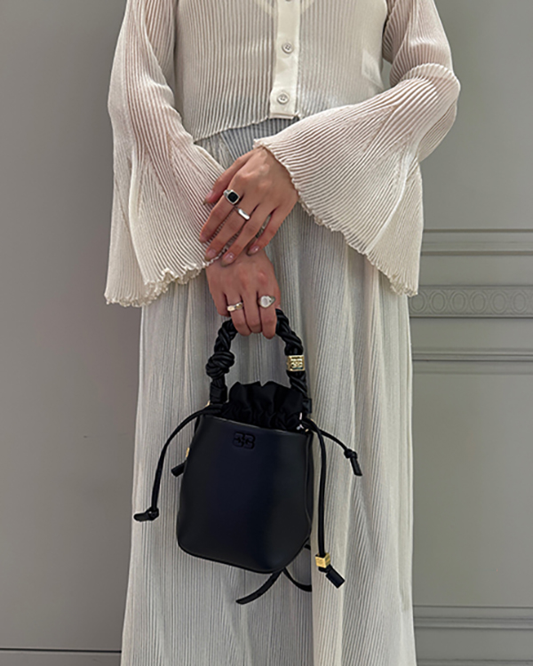 新作のBAOのコロンとした存在感のあるデザインで、シンプルなスタイリングでも華やかになりますよね。秋に向けてのブラックコーディネートにゴールド合わせは大人の女性にオススメスタイリングです。