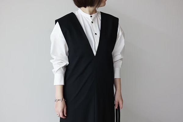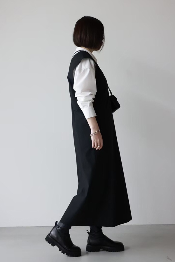 深めのⅤネックが特徴的なワンピースは、重ね着次第でシーズン長く愛用できる優秀さが魅力。