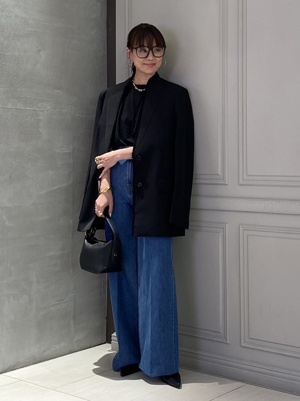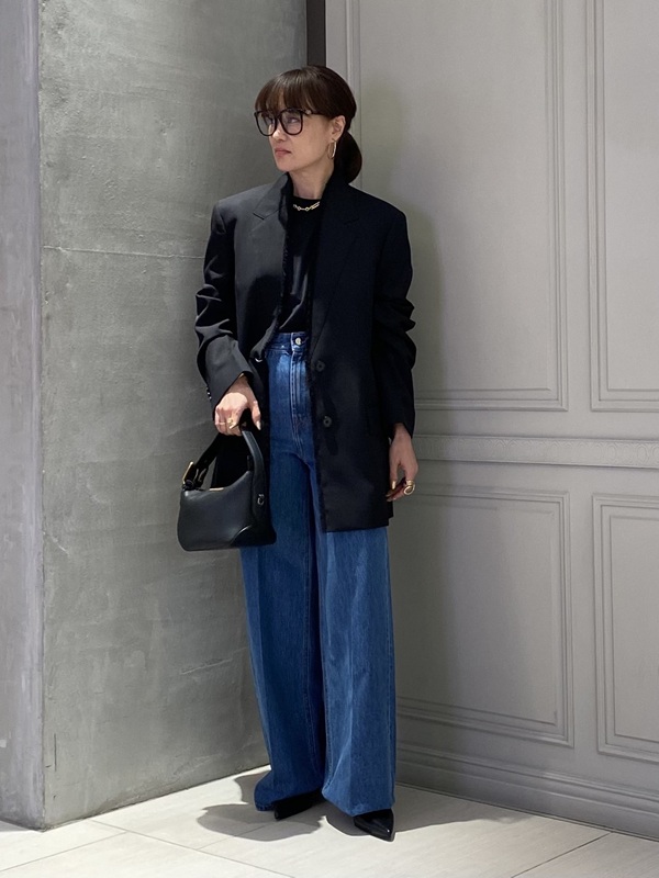ジャケットをカジュアルダウンするデニム合わせもおすすめ。タックが入ったハイウエストのワイドレッグデニムで、太すぎず細すぎず、足をキレイに長く設計になっています。