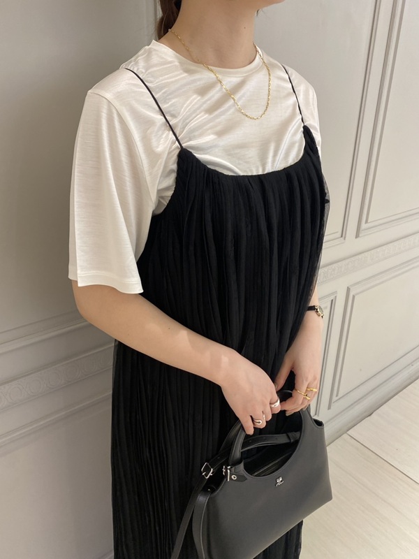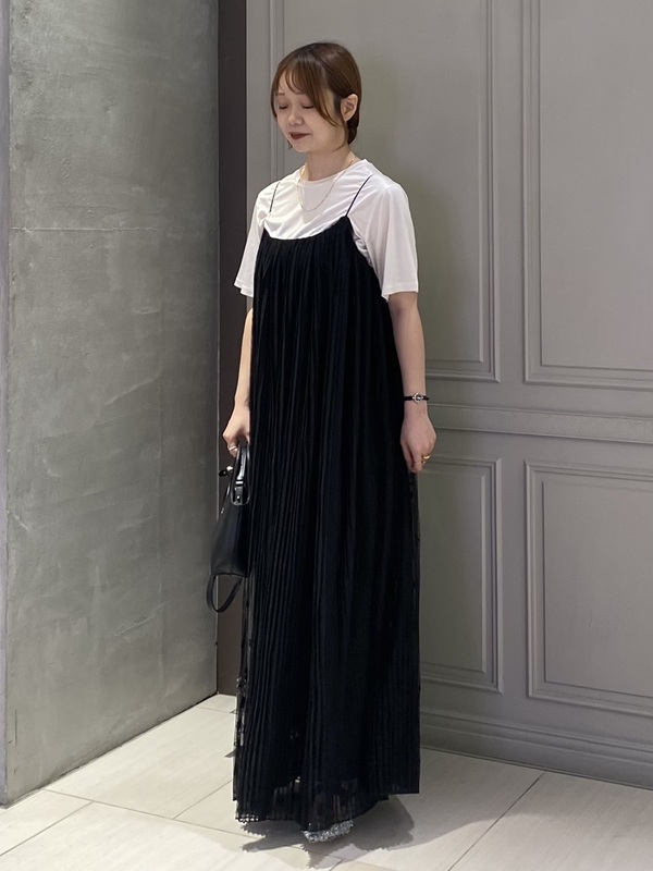 上記のトップスと同様、チュールを使用したキャミソールワンピースです。裾にはたくさんの花柄刺繍が施され、歩くたびに揺れるデザインが美しいです。長めのマキシ丈ですので、ヒールで合わせて女性らしく着ていただくのがおすすめです。