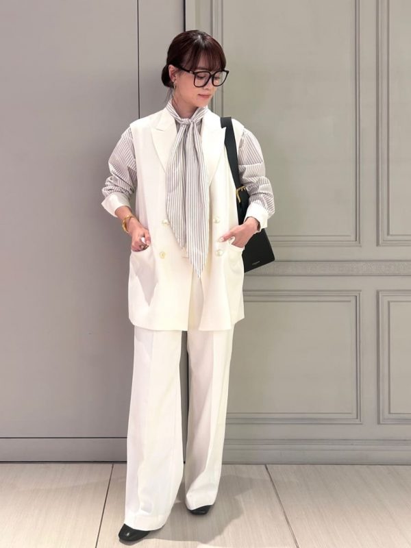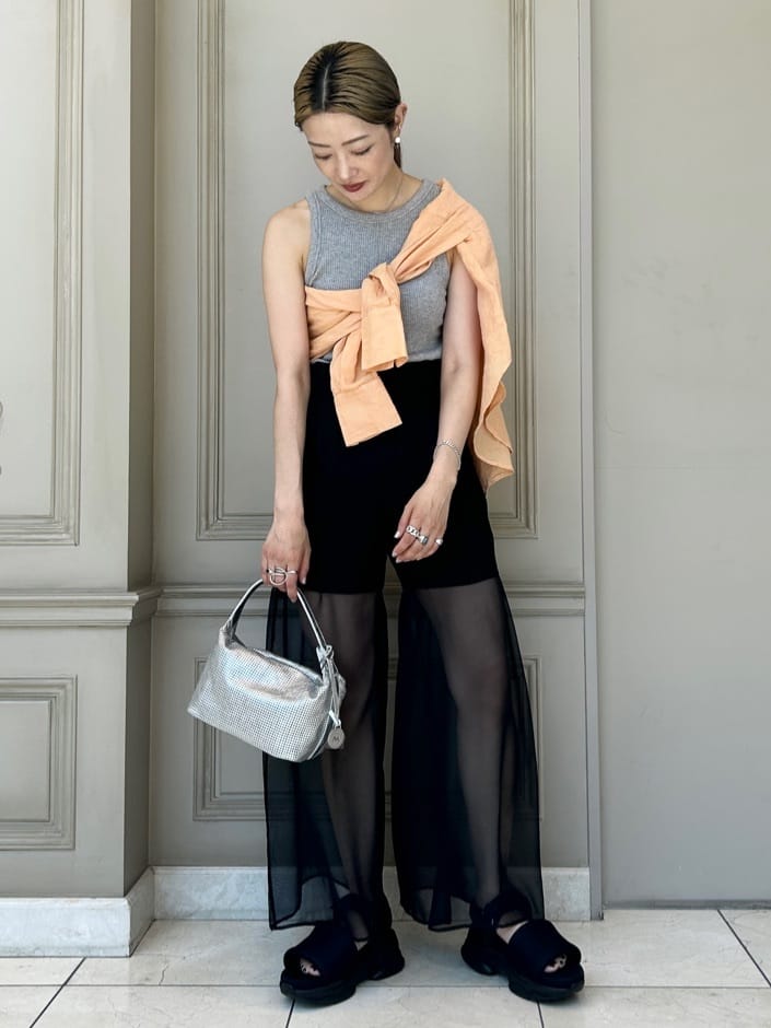 着こなしポイント : ラメタンクとサテンパンツの艶のある上下に柔らかなカラーリングのイエローをオンして、大人っぽい抜け感のあるリラクシーなスタイルにまとめました。