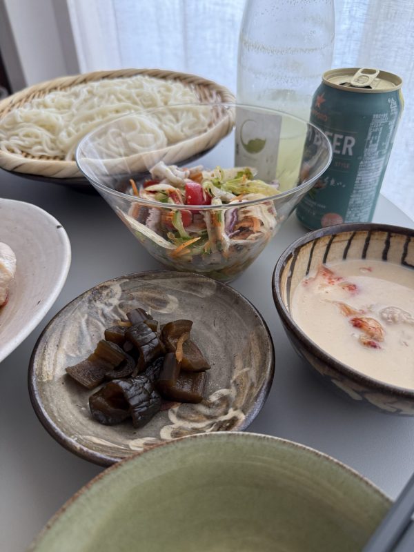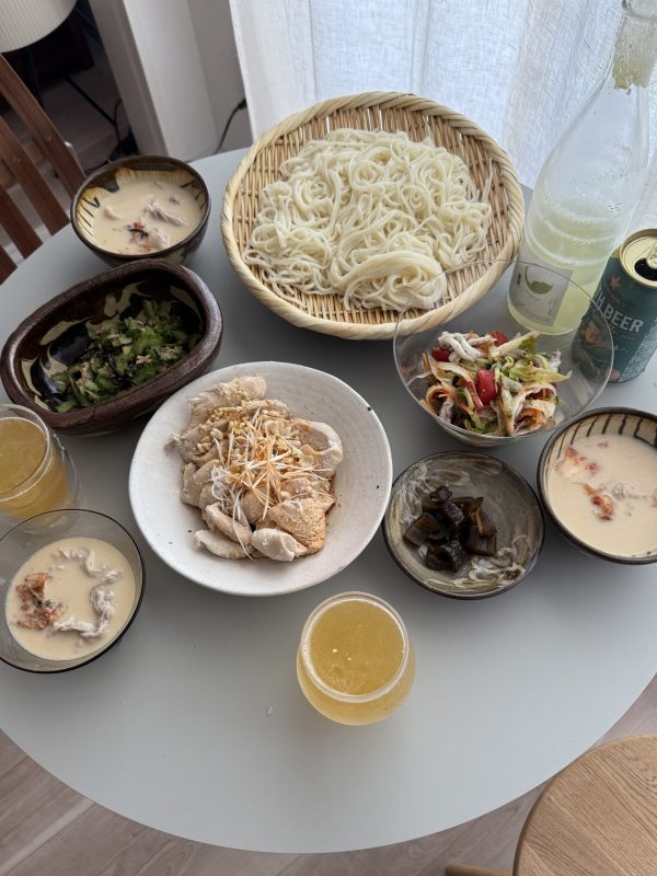 つるっと喉越しのいい麺を、この日は豚しゃぶとキムチの豆乳つけダレで頂き、集まったスタッフにも大好評(?!)