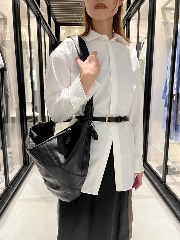 シャツのシャープなラインや、スカートのストレートな落ち感に対して、LEMAIRE(ルメール)のクロワッサンバッグの丸みあるシルエットを取り入れることで、全体の印象を中和し、女性らしさを引き立てます。