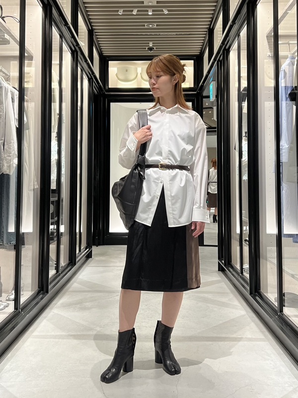 肩パッド付きのメンズライクな白シャツをベースに、艶のあるミディアム丈のスカートで、強さとフェミニンのバランスをとったスタイリング。