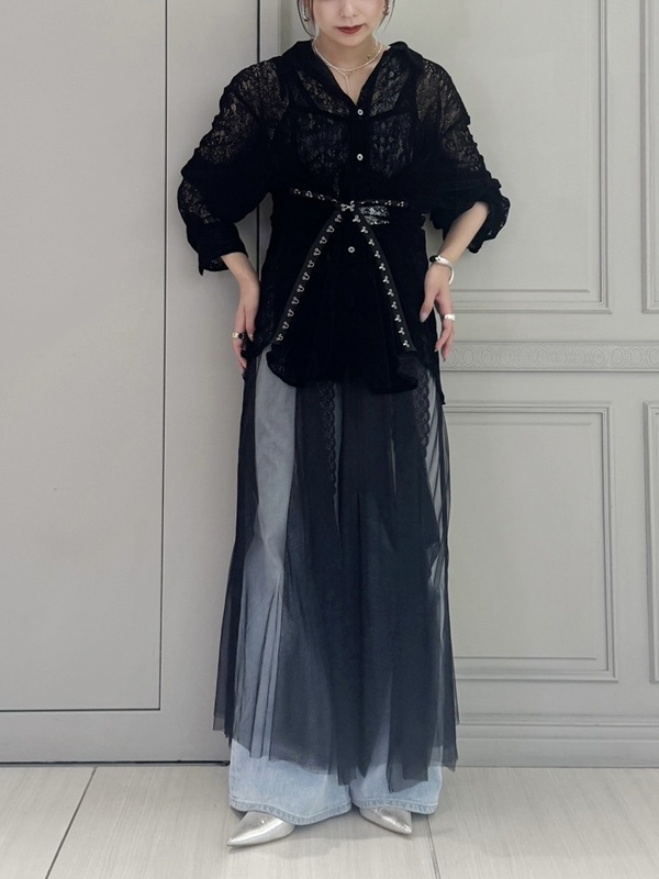 Chika Kisadaのチュールワンピースに、レースシャツを合わせたハイレイヤードスタイル。
