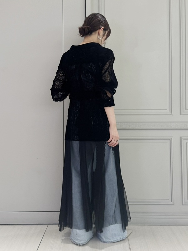 チュールの透け感をプラスすることでカジュアルなデニムがエレガントな印象に!