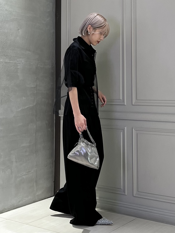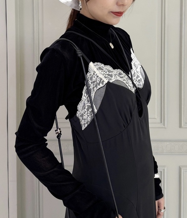 こちらはベロアのボディスーツに、スリップドレスを重ねたモードなお出かけスタイル。