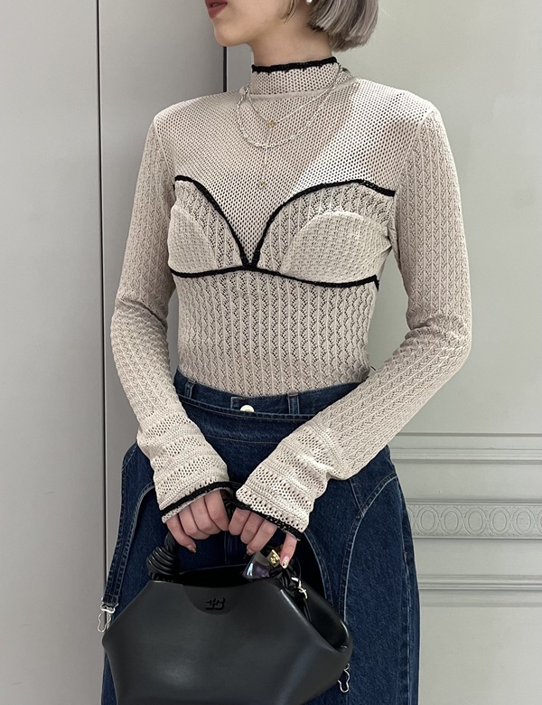 こちらは大胆なブラックのラインが目を惹く、FETICOのボディスーツに、Chika Kisadaのワイドデニムを合わせたカジュアルコーデ。
