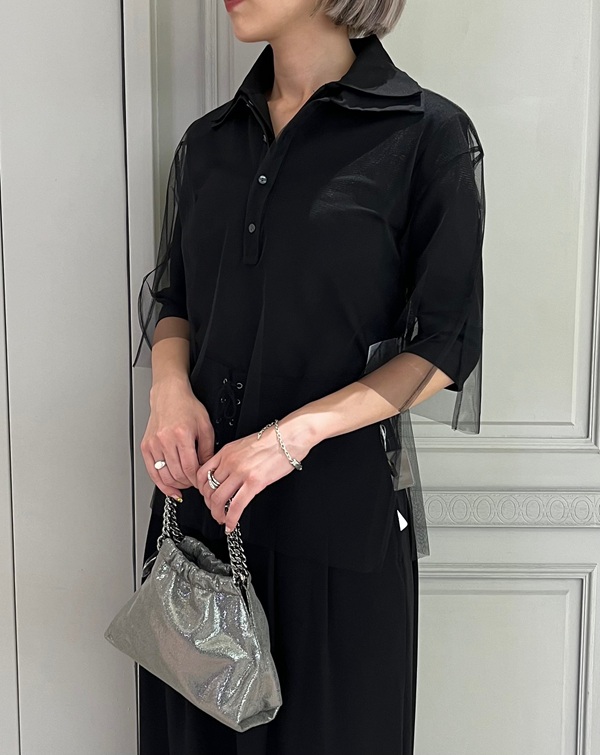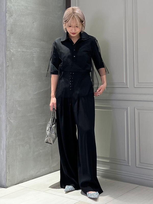 こちらはChika Kisadaのチュールポロシャツに、FETICOのハイウエストパンツを合わせた、ハンサムなブラックコーデ。
