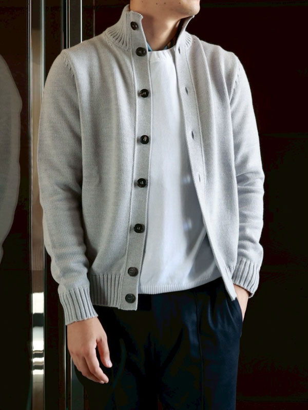 スタイリングはネイビーからが引き立つようにグレーのアウターを。