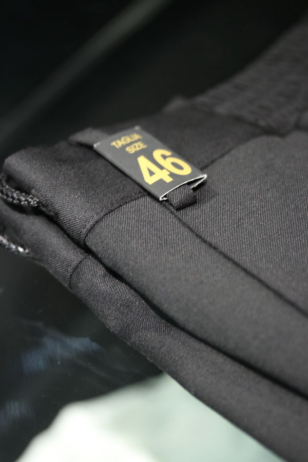 ポイント:フロントにはシャープな印象を強調するクリースラインのステッチこそありますが、素材の特性上見え方はややジャージ。