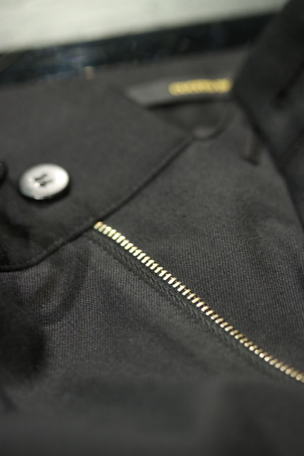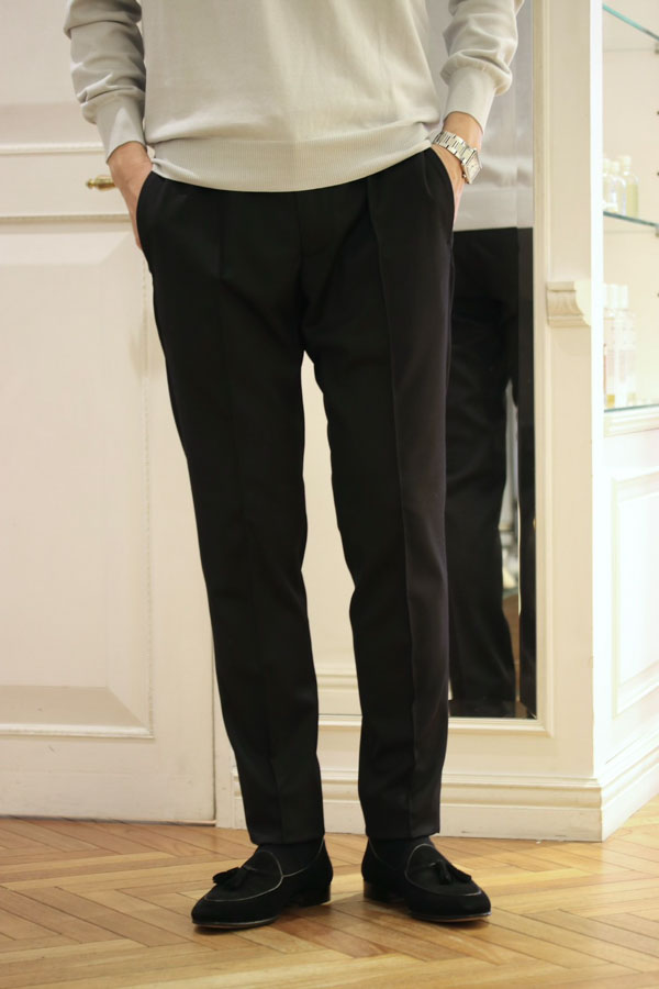 このタイプのスラックスは生地が柔らかい分、肉感を拾いやすいのですが、最低限生地に厚みを持たせることで、綺麗なシルエットとなっています。