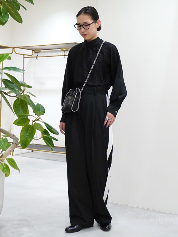 光沢感のあるブラウスでほんのり女性らしさを出しつつ、サイドに太めの白ラインが入ったワイドパンツで洗練モードなスタイリングに。