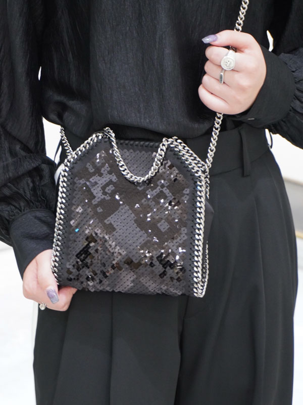 角度によってきらっと光るスパンコールが存在感たっぷりで、持つだけでスタイリングが一気に華やかになります。普段のモノトーンコーデに合わせるのはもちろん、ドレスアップしたい日にも活躍してくれる万能バッグです。