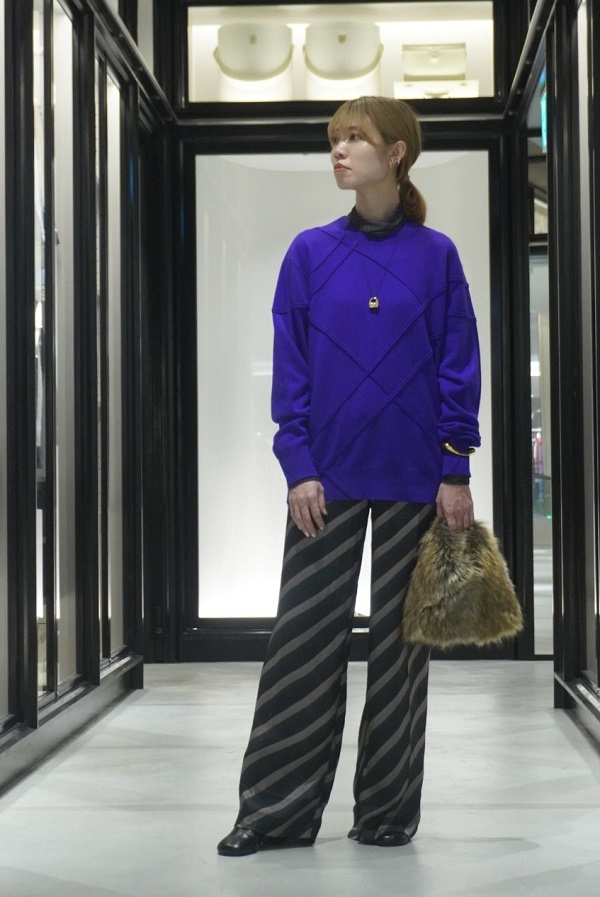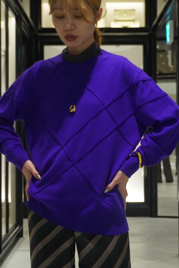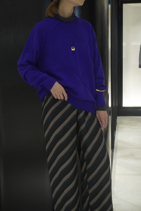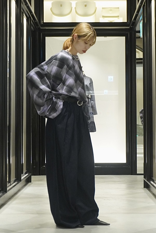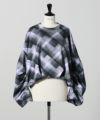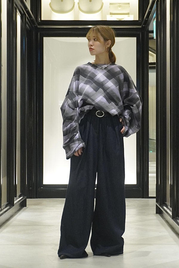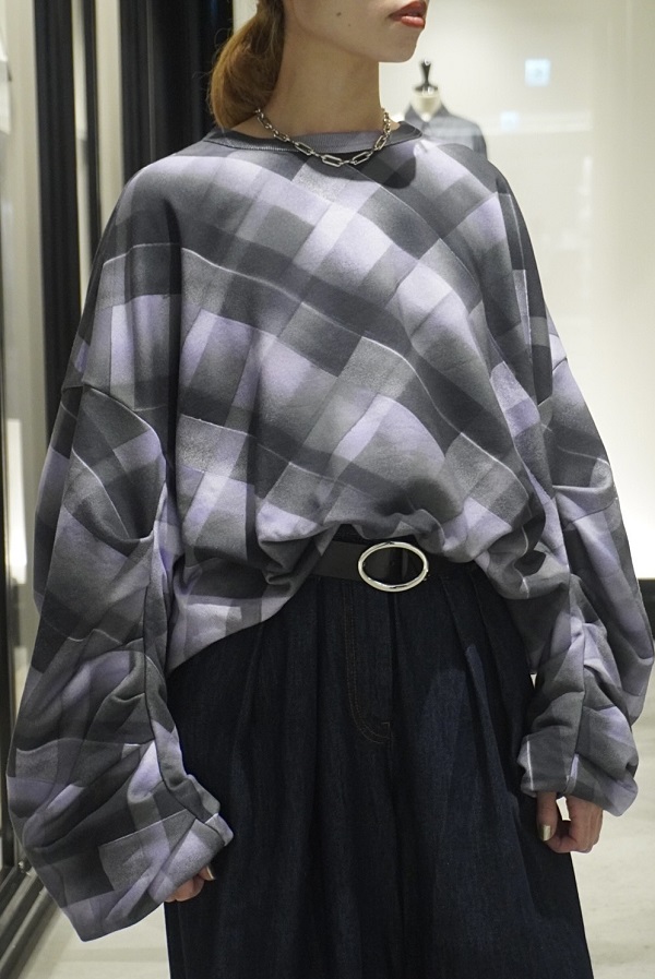デニムジャケットと同じコクーン型のスウェット。スプレーペイント風のチェック柄がなんともアート的な雰囲気を放ち、カジュアル見えしがちなスウェットをモードに仕上げてくれます。