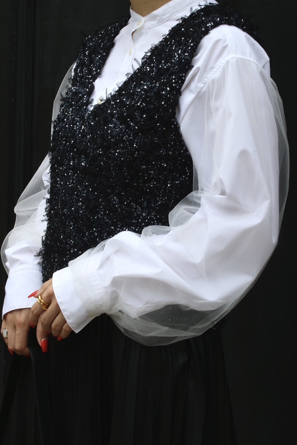 秋のおしゃれランチには、シャツ×ベストで旬のレイヤードコーデに。お袖のチュールがまたおしゃれ度をアップしてくれます。